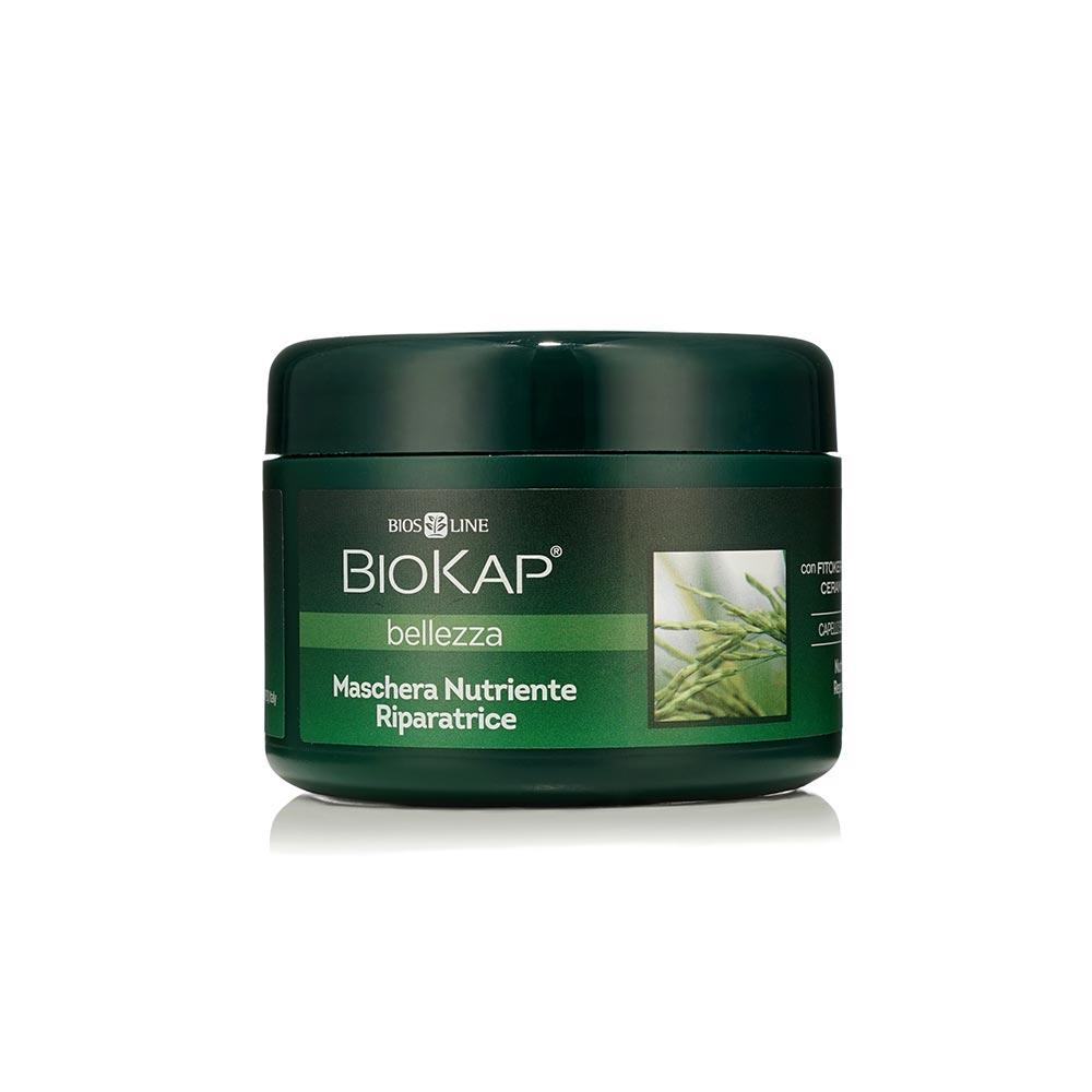 Zawiera hydrolizowaną fitokeratynę z ryżu, która zachowuje się podobnie do naturalnie występującej keratyny – wypełnia włókna włosowe, wzmacniając trzon włosa i przeciwdziałając rozdwojonym końcówkom. Fitokeratyna wnika głęboko we włosy i rekonstruuje pierwotną strukturę włosa, dzięki czemu odzyskują miękkość, nawilżenie i blask. Ceramidy roślinne z oliwy z oliwek i olejek ze słodkich migdałów pomagają odbudować zniszczone końcówki oraz dają silnie odżywczy efekt dla całych włosów. Najlepsze efekty uzyskuje się wraz z użyciem szamponu rewitalizująco-naprawczego BIOKAP. Odżywcza maska Biokap to intensywny zabieg na suche, zniszczone, łamliwe i rozszczepione włosy. Bogata w składniki roślinne sprawia, że włosy staja się jedwabiście błyszczące.