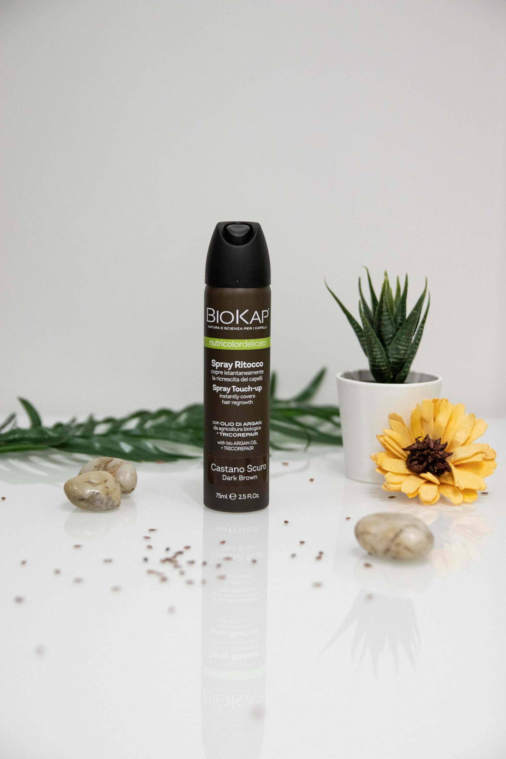 Produkty w sprayu od lat mają zastosowanie w kosmetyce czy farmacji. Są wygodne, łatwe w użyciu i zawsze można je mieć przy sobie. Teraz także do grupy tych produktów dołączają farby do włosów. Biokap wykorzystał tę znaną od lat technologię by przygotować rewolucyjny produkt pozwalający szybko i skutecznie przykryć każdą różnicę włosów pojawiającą się pomiędzy jednym a drugim farbowaniem. Dzięki Nutricolor Spray nie tylko przedłużysz efekt farbowania i przykryjesz każdy odrost czy siwy włos, ale także doskonale odżywisz, nawilżysz i zregenerujesz włosy. Tak jak większość farb zawiera naturalne składniki, formułę TRICOREPAIR – białko ryżowe, wyciąg z wierzby i lipofilowe kwasy owocowe. Wzbogacony jest witaminą B5 i organicznym olejem arganowym aby zapobiegać wysuszeniu włosów.