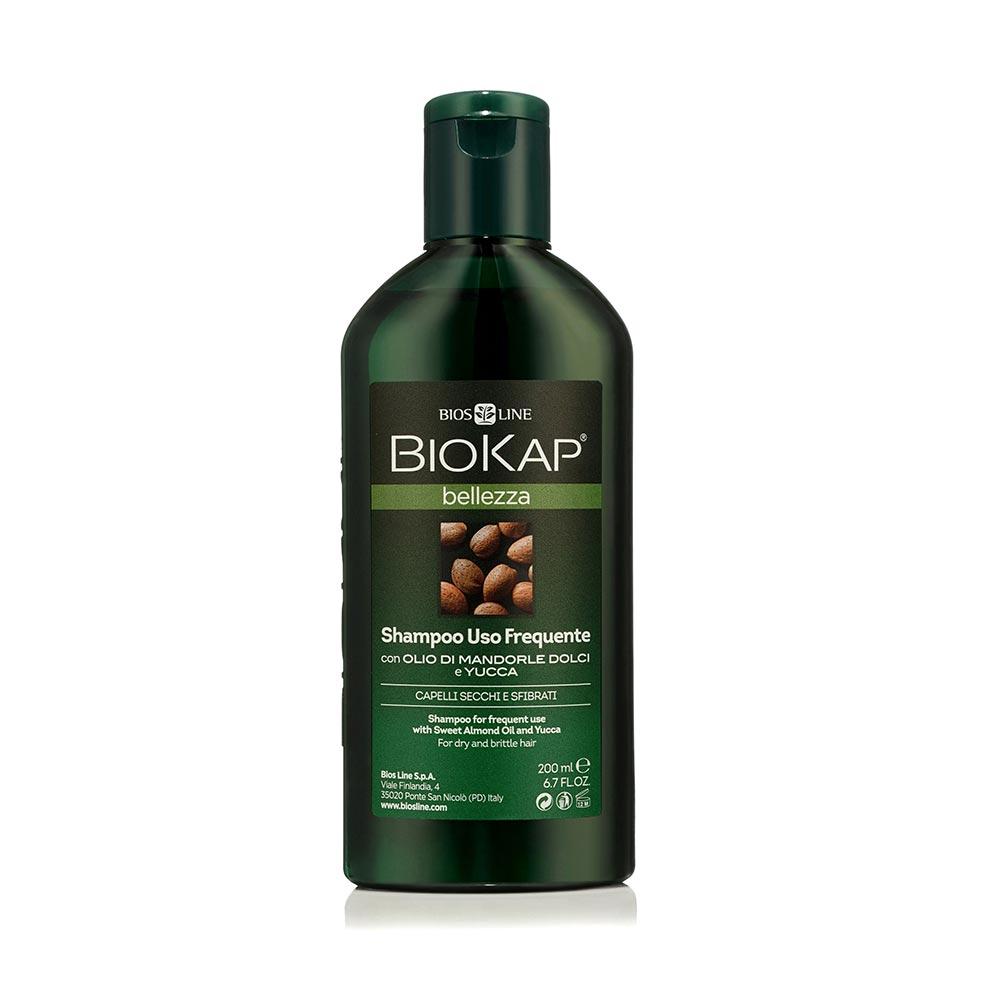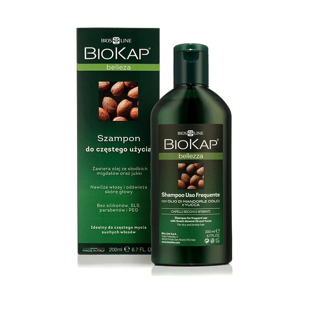 Silne, zdrowe i piękne włosy – taki jest efekt stosowania szamponu Biokap. Olejki i ekstrakty roślinne nawilżają, oczyszczają i odświeżają. Szampon do częstego użycia delikatnie myje pozostawiając włosy gładkie i błyszczące. Olej z migdałów gwarantuje efekt jedwabistych włosów, a jednocześnie pozostawia na włosach delikatny zapach. Idealny do częstego mycia suchych włosów. Zawiera olejek ze słodkiego migdała, olejek z kokosa i wyciąg z ekologicznych upraw prawoślazu lekarskiego. Wyciągi z passiflory, winogron i ananasa zapewniają efekt odbudowujący i nawilżający. Saponiny z Jukki delikatnie myją włosy, a porost islandzki i olejki eteryczne z rozmarynu i drzewa herbacianego skutecznie odświeżają skórę głowy. To szampon z wysoką zawartością aktywnych składników naturalnych. Po każdym użyciu włosy są miękkie i jedwabiste. Szampon naturalny – bez parabenów, silikonów, emulgatorów PEG, SLS. Testowany pod względem niklu. Produkt nietestowany na zwierzętach. Pojemność 200 ml