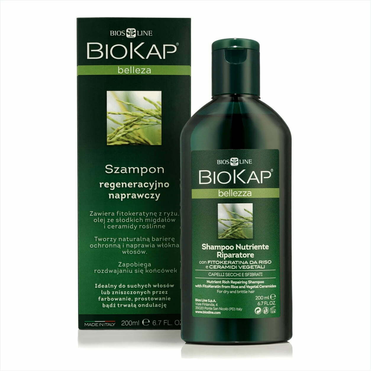 Keratyna to białko będące głównym budulcem włosa. Regeneracyjno-naprawczy szampon BIOKAP B zawiera hydrolizowaną fitokeratynę z ryżu. Zachowuje się ona podobnie do naturalnie występującej keratyny – wypełnia włókna włosowe, wzmacniając trzon włosa i przeciwdziałając rozdwojonym końcówkom. Fitokeratyna wnika głęboko we włosy i rekonstruuje pierwotną strukturę włosa, dzięki czemu odzyskują one miękkość, właściwe nawilżenie i blask. Ceramidy roślinne z oliwy z oliwek i olejek ze słodkich migdałów pomagają odbudować zniszczone końcówki oraz dają silnie odżywczy efekt dla całych włosów.